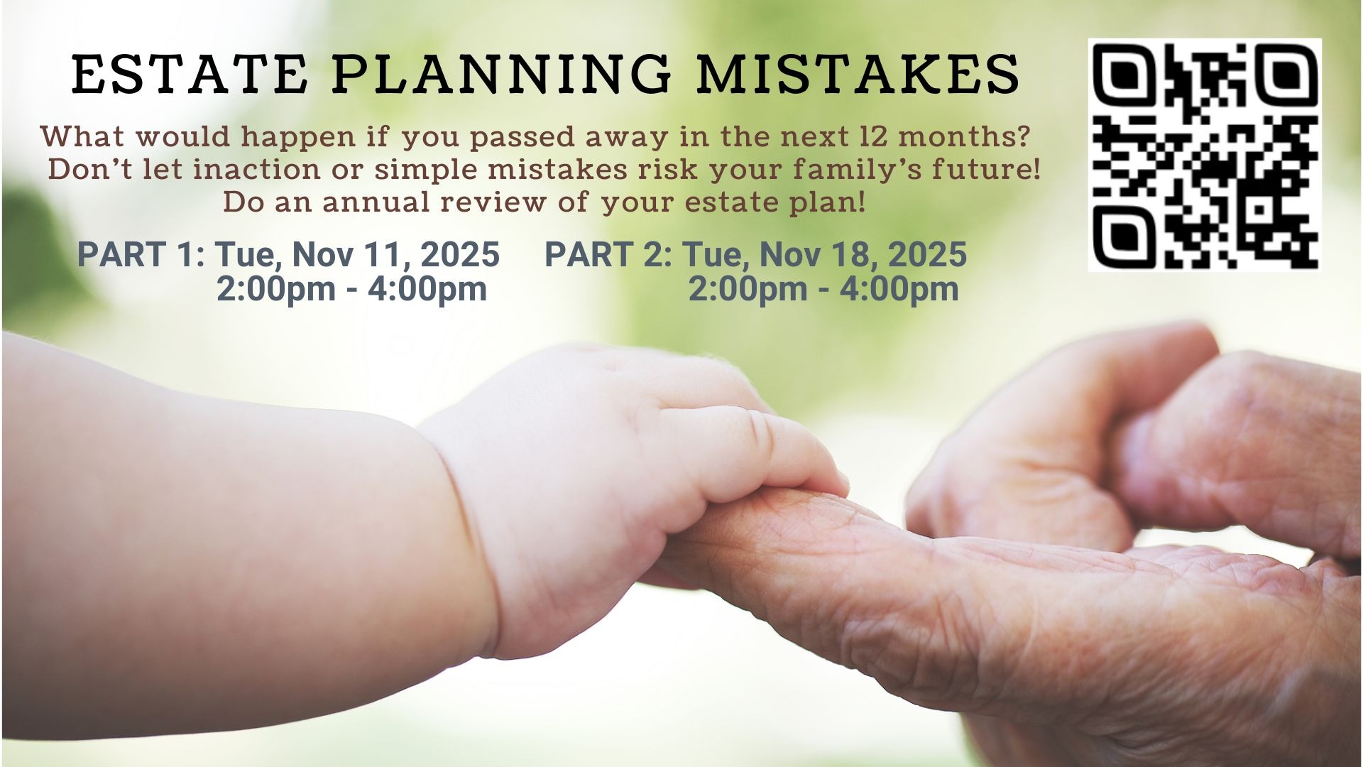 In Part 1 of this workshop, we'll cover up to 65 mistakes people make when preparing their estate plan, e.g., one family lost $200k from one mistake that would have taken 5 minutes to fix if discovered beforehand.